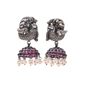 Klasik tavuskuşu tasarımı okside gümüş renkli taş çivili bayan sarkan Jhumka küpe nedensel veya günlük giyim için